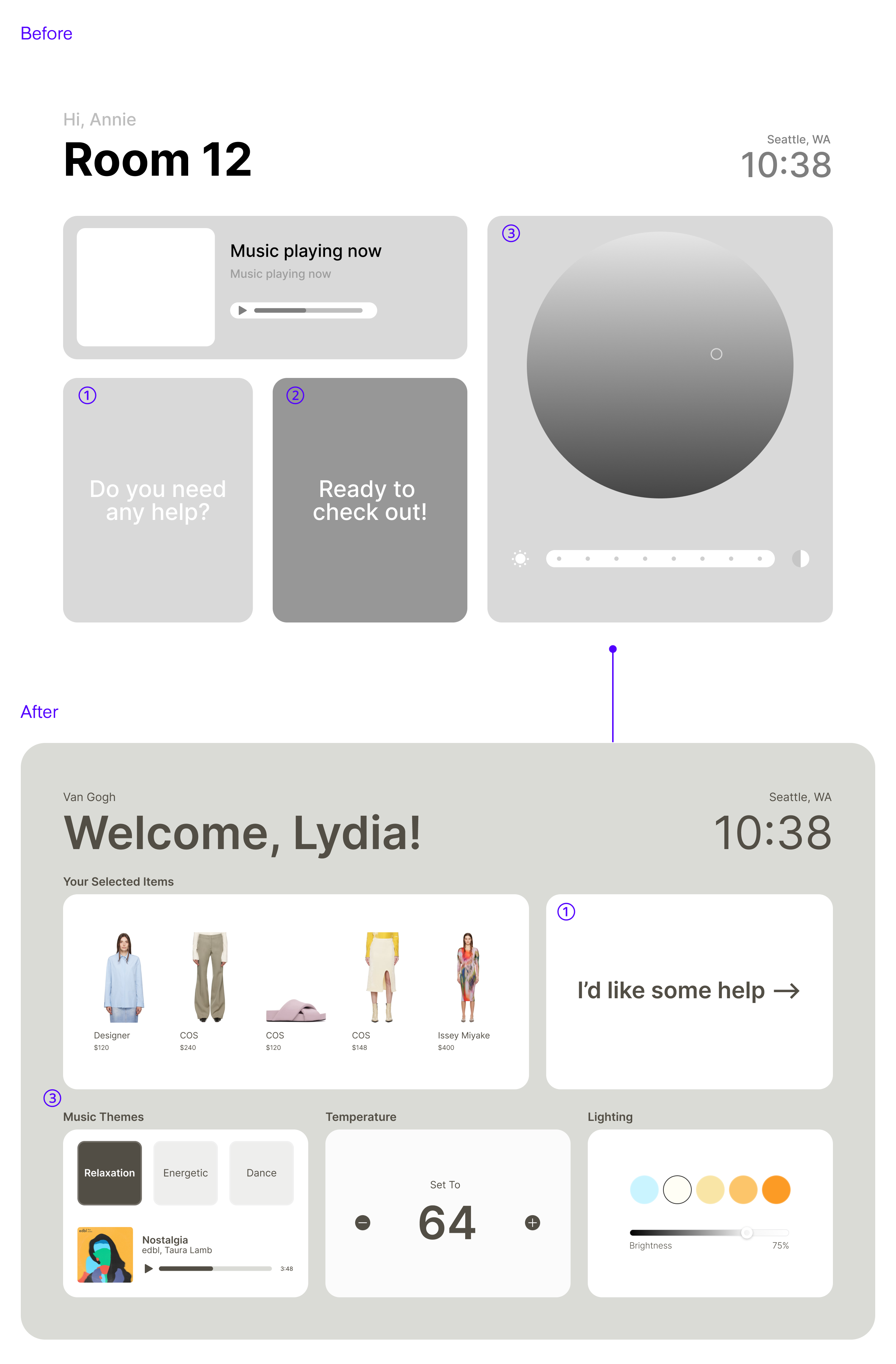 Using these, we voted on our final concept, "Artful Installation," which integrates features such as a wishlist and the help button, drawing from other explored ideas.