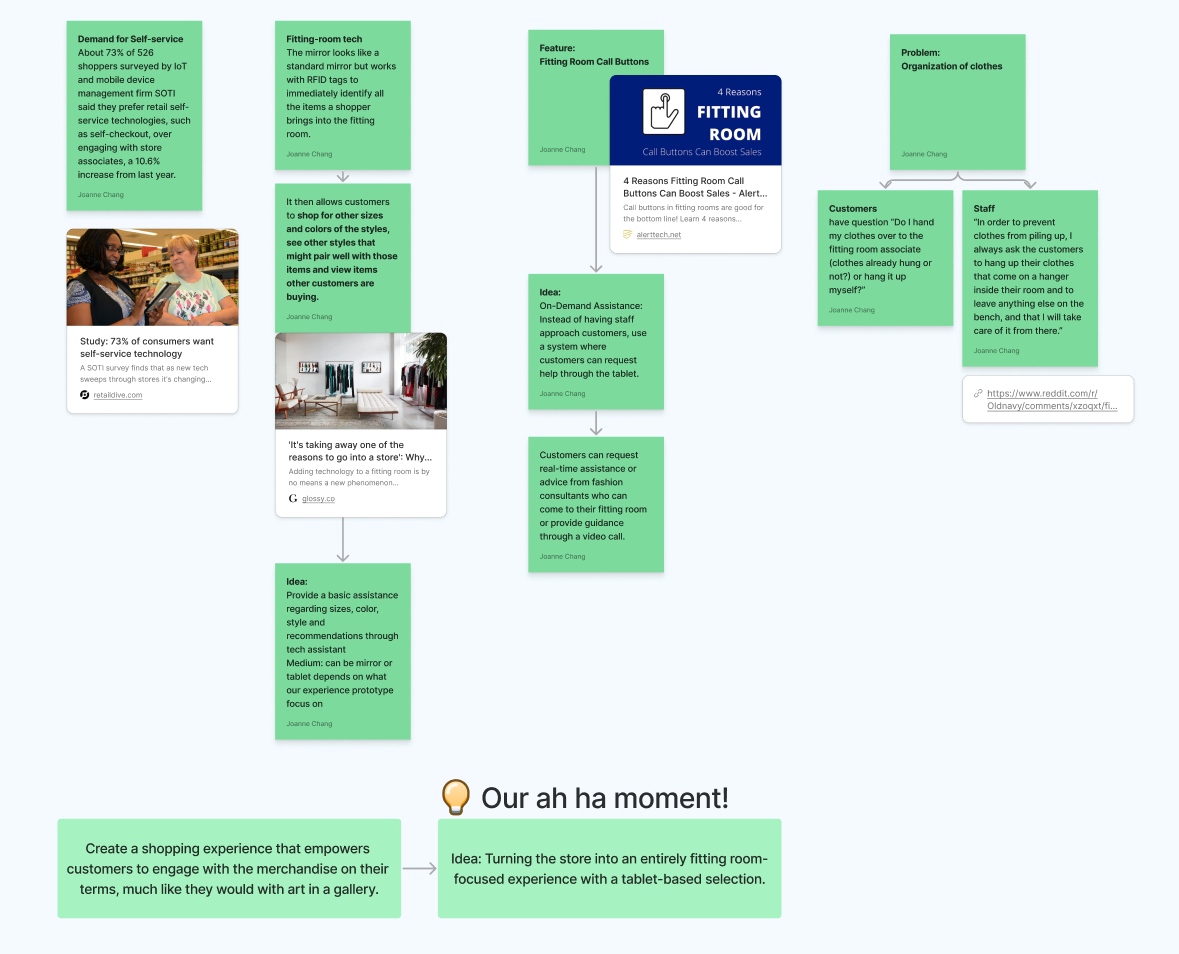 In response, I researched online discussions and conducted informal interviews over a weekend to identify user pain points in dressing experiences. This led to a team consensus on developing a self-guided fitting experience, transforming the store with a tablet-based selection system, and significantly enhancing our service design.