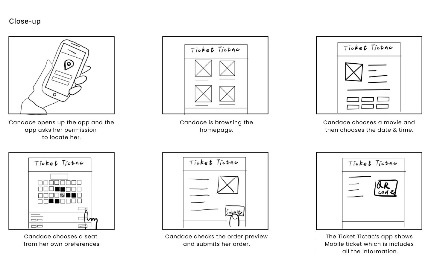 Using storyboard as a tool to visualize potential solutions to problems that the user is facing. I want to include emotion in our big picture storyboard, so I could focus on how will the user use our app. Why will it be helpful? And why will the user be delighted by the app? In the close-up storyboard, it is more useful to focus on the details of the product.