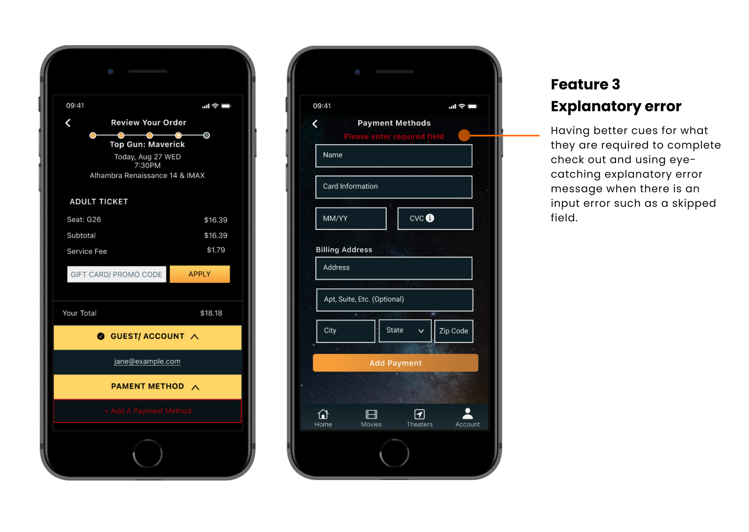 Based on the usability test, I adjusted some layouts and added highlights, explanatory error messages, and cues to help users to complete checkout. After the 2nd round of testing, I ensured it solved the problems that users were easy to ignore the Guest/Account and Payment feature and also can benefit users who didn't have experience with buying a ticket on the app. I also identified some key features that could be used to smooth the purchase process.