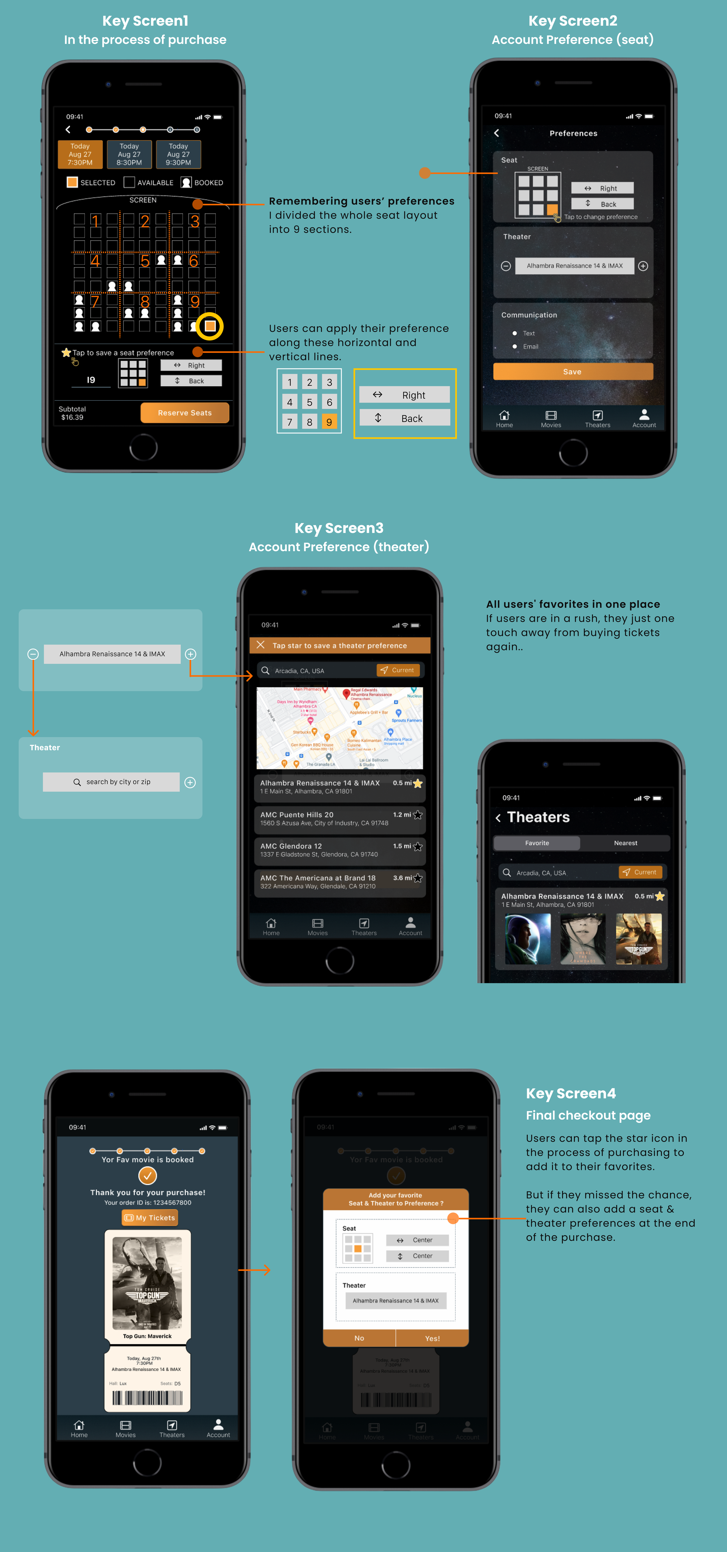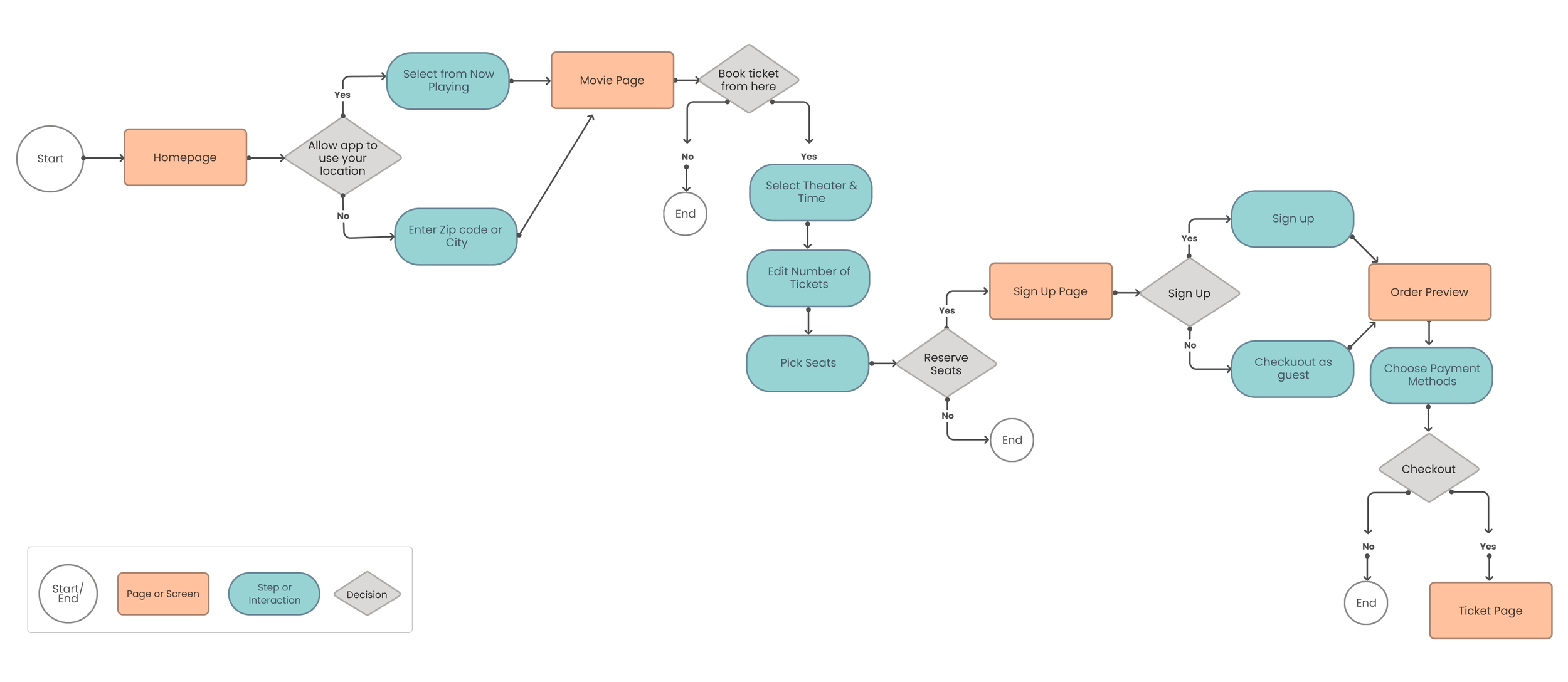 I started by conducting a competitive audit to find if there is any potential problems that I can solve. I compared the purchasing experience of our competitor’s web & app, I found most of them have a well-designed flow that users can buy a movie ticket on their devices. However, some of them do not have a clear color scheme and art direction which could make users feel frustrated and confused.