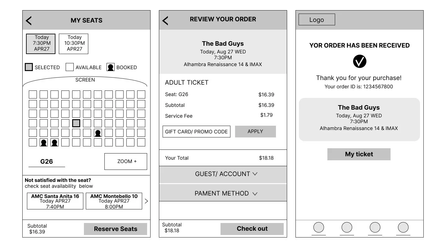 This is what the early wireframes looked like. I map out the whole process of buying a ticket, identify the purpose of each section, aligning it with the design principles-Aesthetic integrity, Consistency and Feedback.